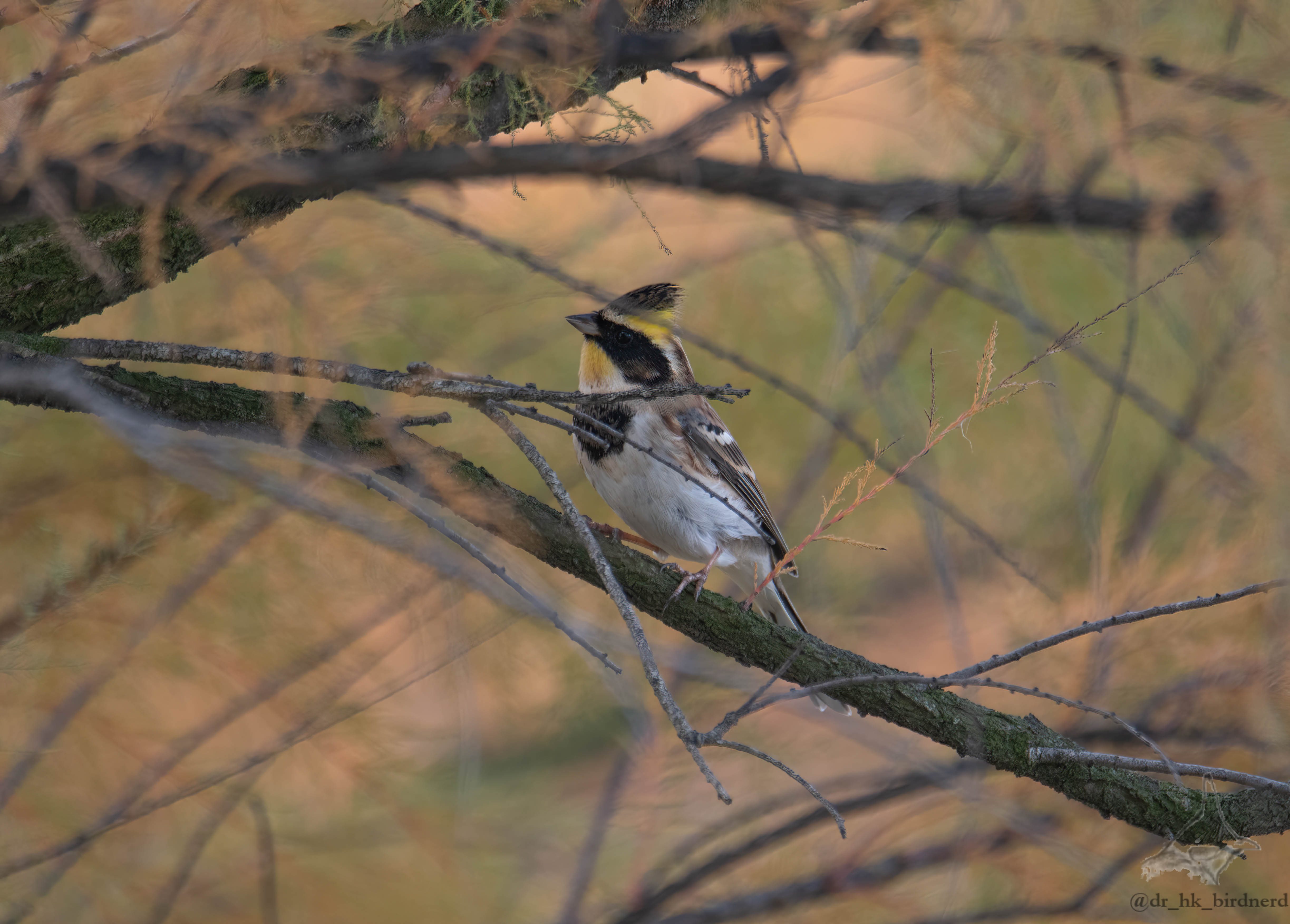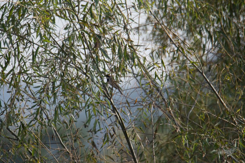 Another bird I spotted rather early on was a yellow-throated bunting. It was hanging out in a tree with another bunting that I couldn’t identify but the both of them would occasionally fly over to the bushes near where I was waiting and forage around a bit on the ground before returning to their tree. They were far too quick the first time they came around. See if you can spot the bunting in the willow!