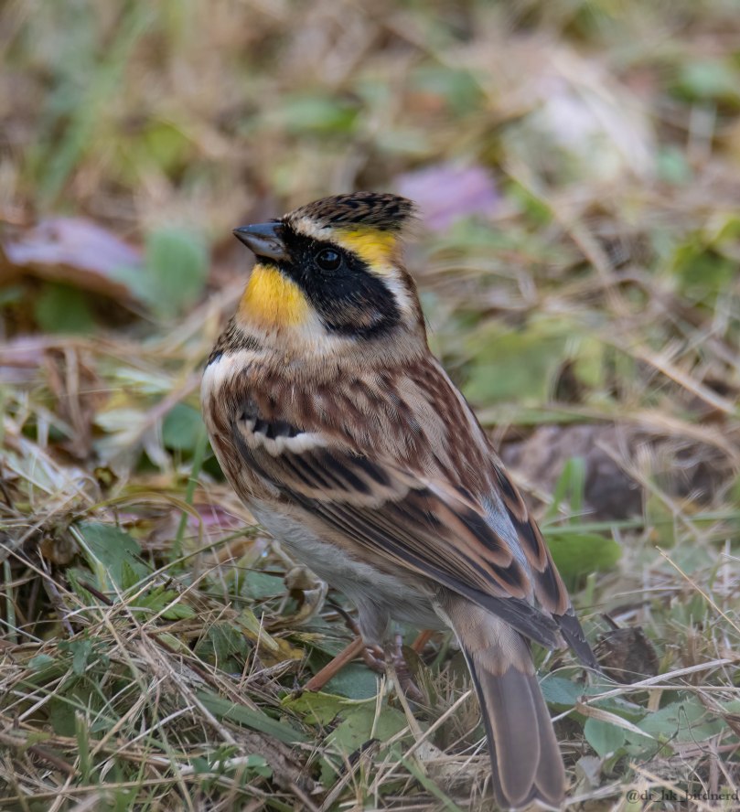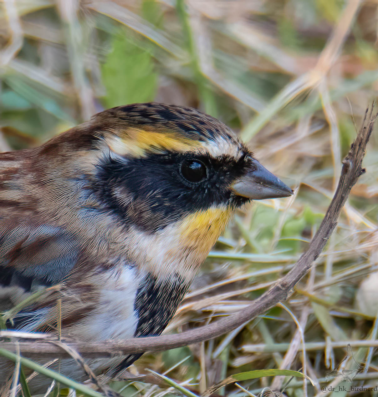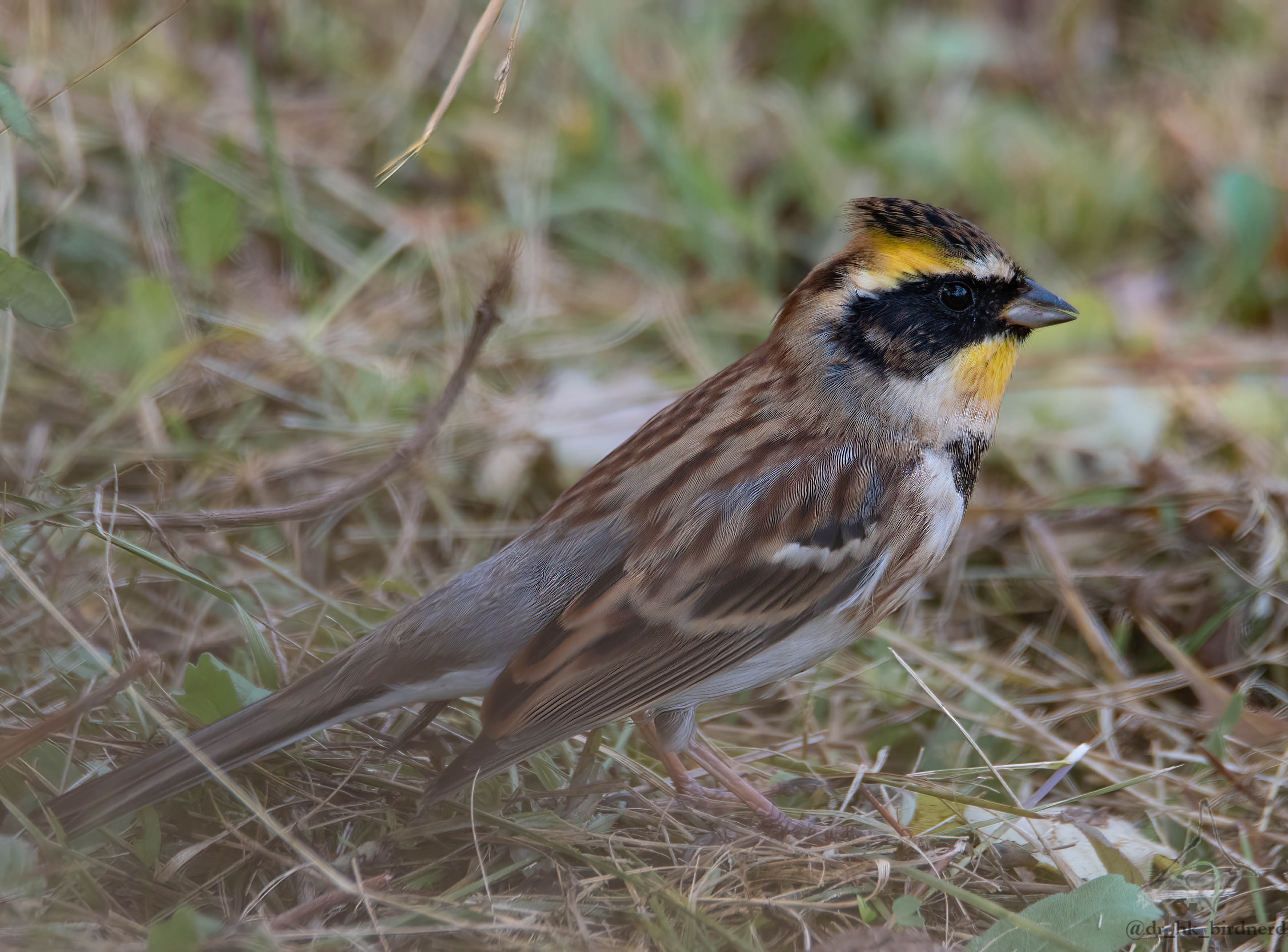But once I packed up for real, I heard a curious call in the bushes right near the visitor center. It was much more varied and sing-song-y than some of the usual bush-dwelling suspects, but I wasn’t sure what it was until I saw it not 2 meters away right at my feet, though hopelessly obscured by brush–the grand prize of the day: a yellow-throated bunting. I could hear it calling in the brush and in a last ditch effort I got out my camera just hoping that it might show itself for a single record shot, but to no avail for the first five minutes.