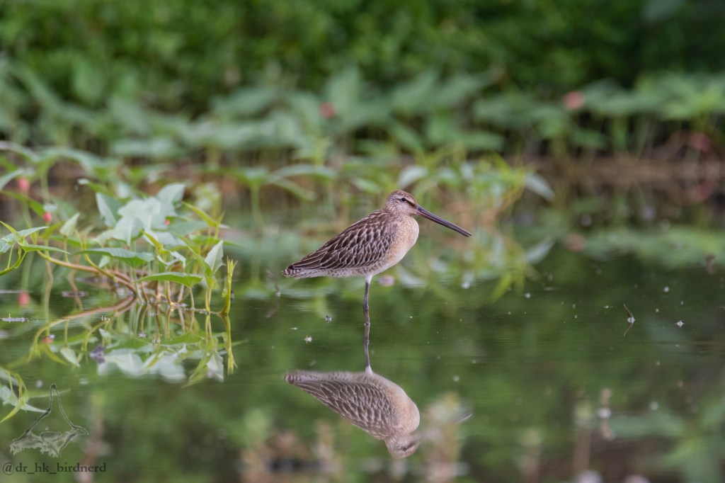 Asian dowitchers have long, straight, black bills with a bulbous tip. The outer feathers are a mixture of dark brown with white at the tips, eventually giving way to a brick-red color when breeding.