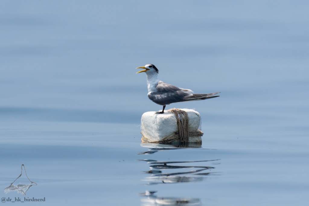 The greater crested tern is a seabird species of the family Laridae. They can occasionally be found in Hong Kong on open waters or rocky shorelines.